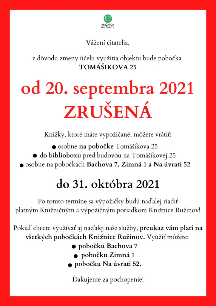 POBOČKA TOMÁŠIKOVA 25 – ZRUŠENIE