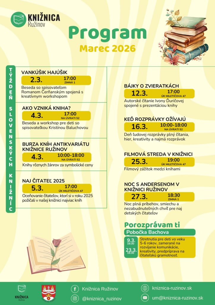 Hneď prvý týždeň je venovaný slovenským knižniciam. Jeho cieľom je pozitívne zviditeľňovať knižnice ako kultúrne a vzdelávacie inštitúcie prostredníctvom rôznych aktivít. Knižnica Ružinov pripravila pre všetkých, okrem mnohých podujatí, aj generálnu amnestiu na upomienky.
