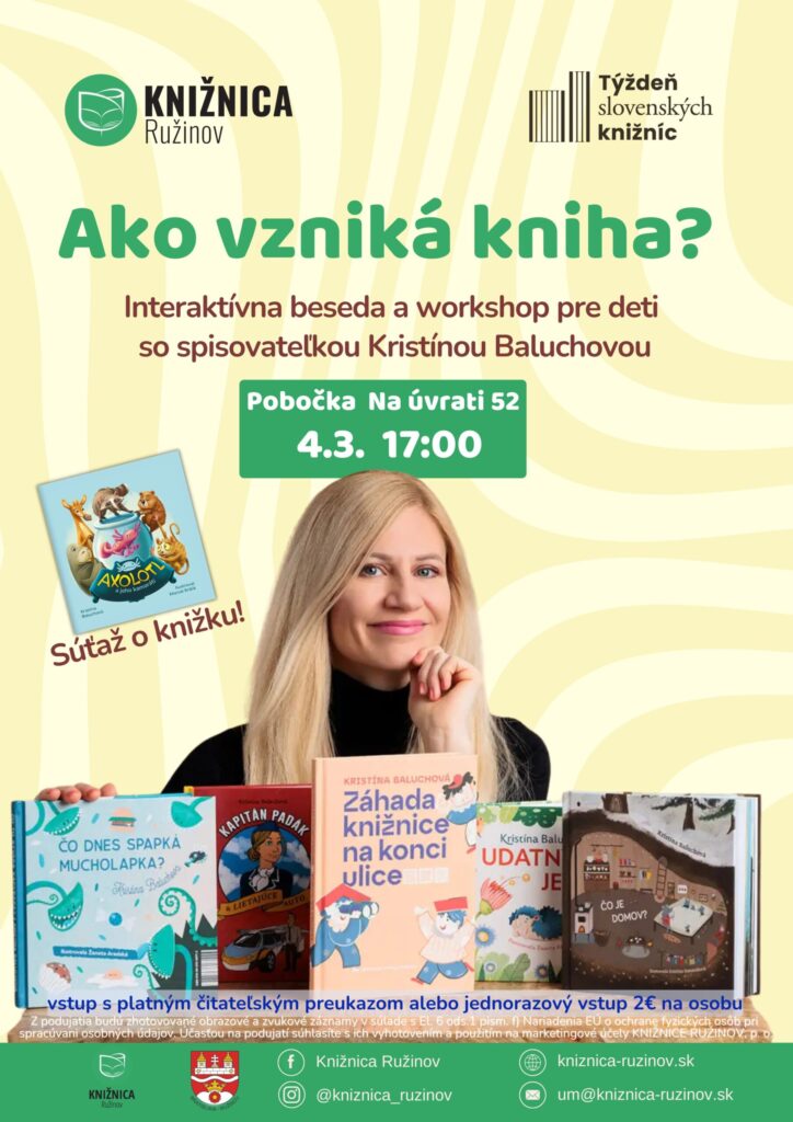 *Z podujatia budú zhotovované obrazové a zvukové záznamy v súlade s El. 6 ods.1 pism. f) Nariadenia EÚ o ochrane fyzických osôb pri spracúvani osobných údajov. Účasťou na podujatí súhlasíte s ich vyhotovením a použitím na marketingové účely KNIŽNICE RUŽINOV, p. o.