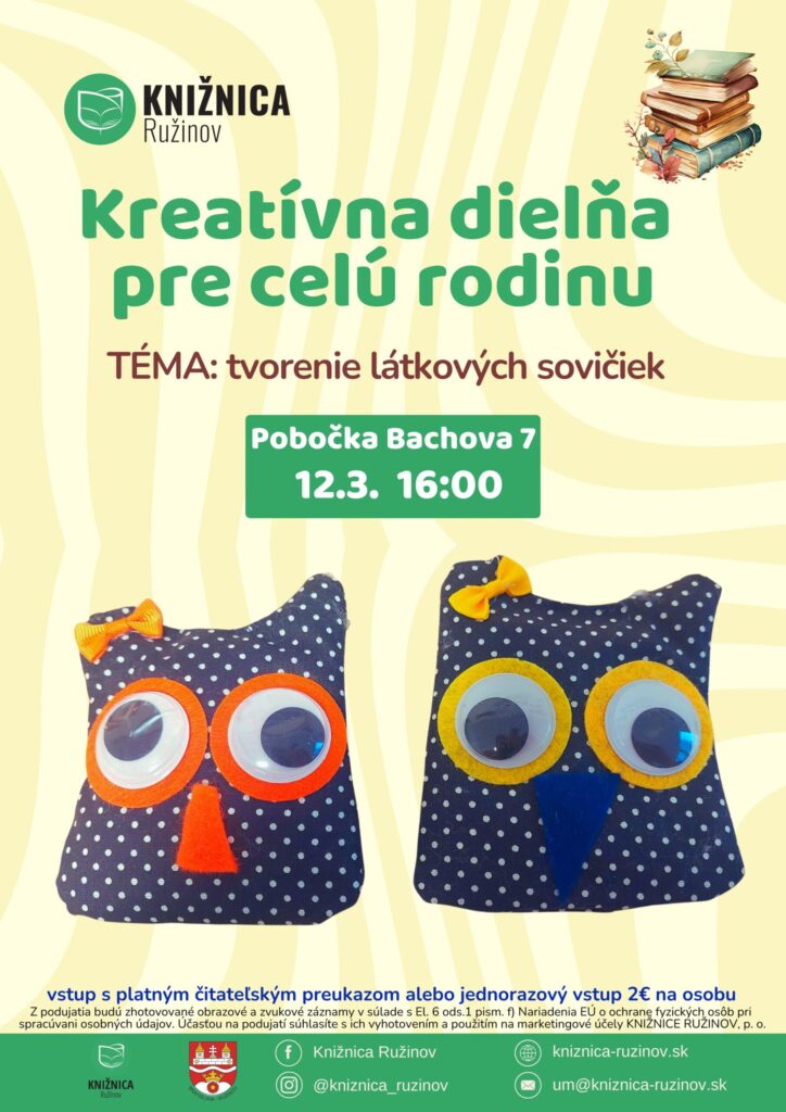 Pozývame Vás do Kreatívnej dielne Knižnice Ružinov na Bachovej 7, kde si môžete spolu s deťmi, rodičmi či starými rodičmi tentokrát vyskúšať vyrobiť látkovú sovičku🦉