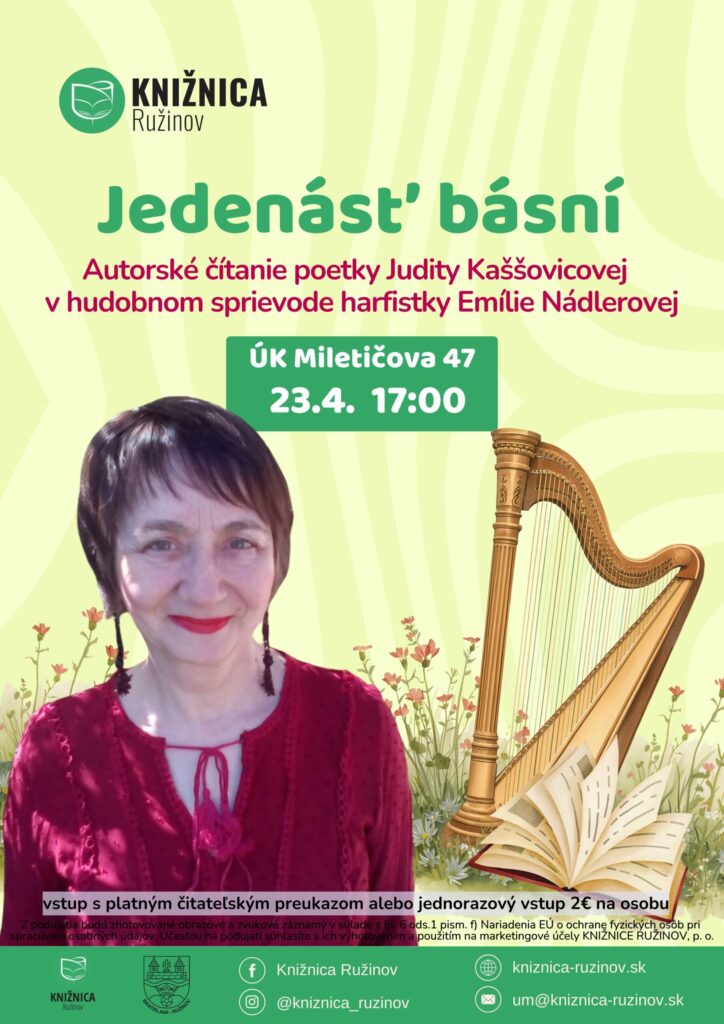 Úspešná poetka Judita Kaššovicová prichádza do Knižnice Ružinov! Spoločne s harfistkou Emíliou Nádlerovou vyčarujú v našej knižnici na Miletičovej čarovnú atmosféru, plnú poézie.