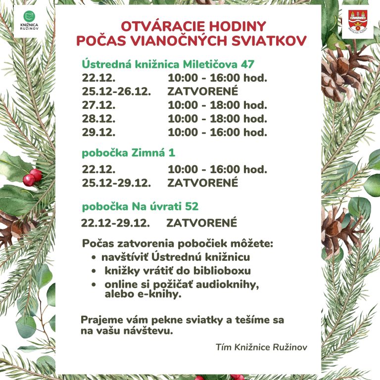 Otváracie hodiny Knižnice Ružinov počas vianočných sviatkov